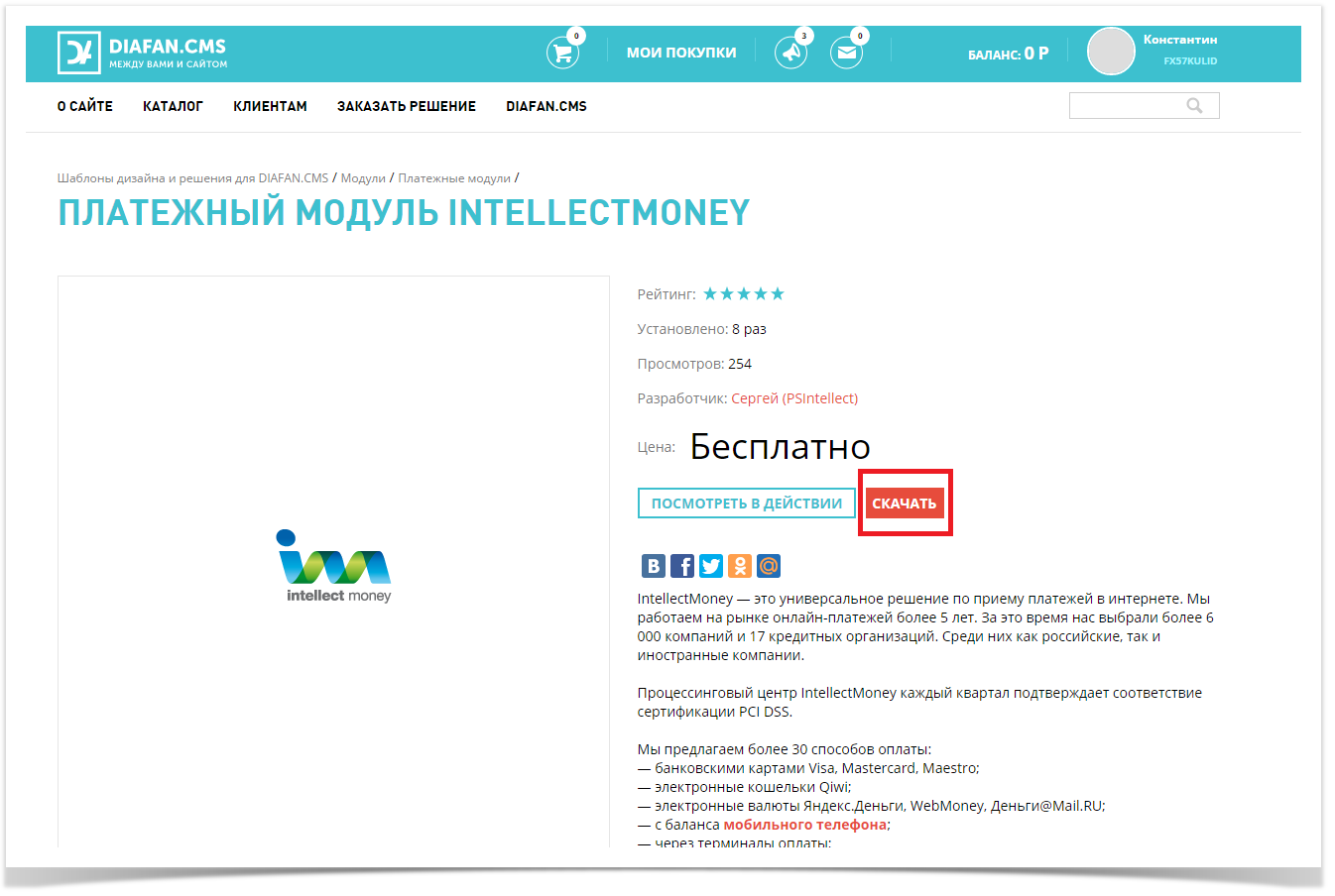 - Загрузить архив с платежным модулем intellectMoney можно здесь нажав на кнопку "Скачать" (необходима авторизация в личном кабинете)