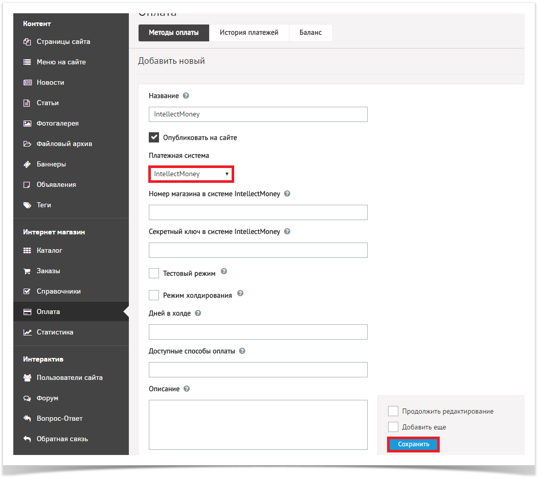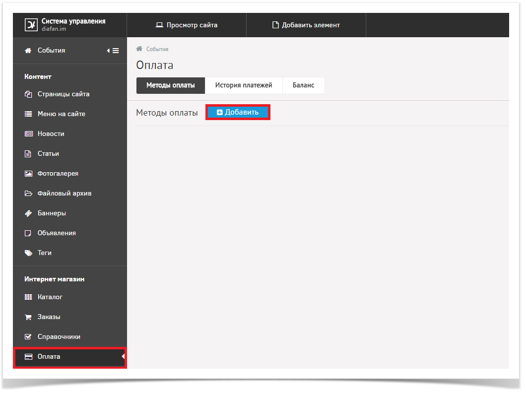 - В админ. панели перейти в раздел «Оплата» нажать кнопку «Добавить»