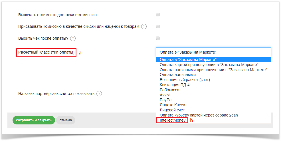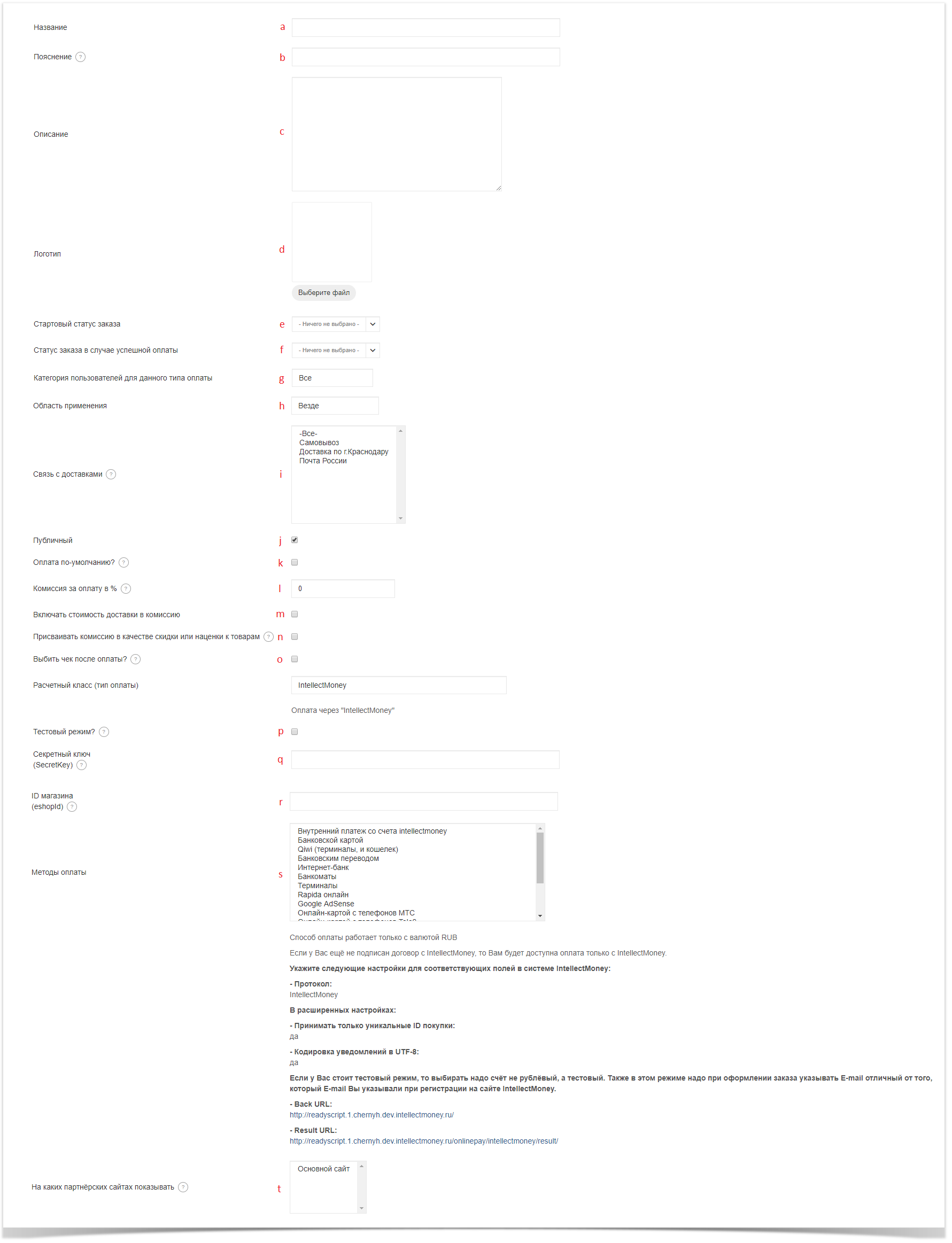 - Описание - описание способа оплаты для покупателей, пример: Оплата платежным агрегатором IntellectMoney. Более 20-ти способов, включая банковскую карту.