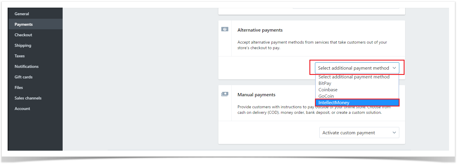 4. В альтернативных способах оплаты в списке 'Select additional payment method' выбираем 'IntellectMoney'
