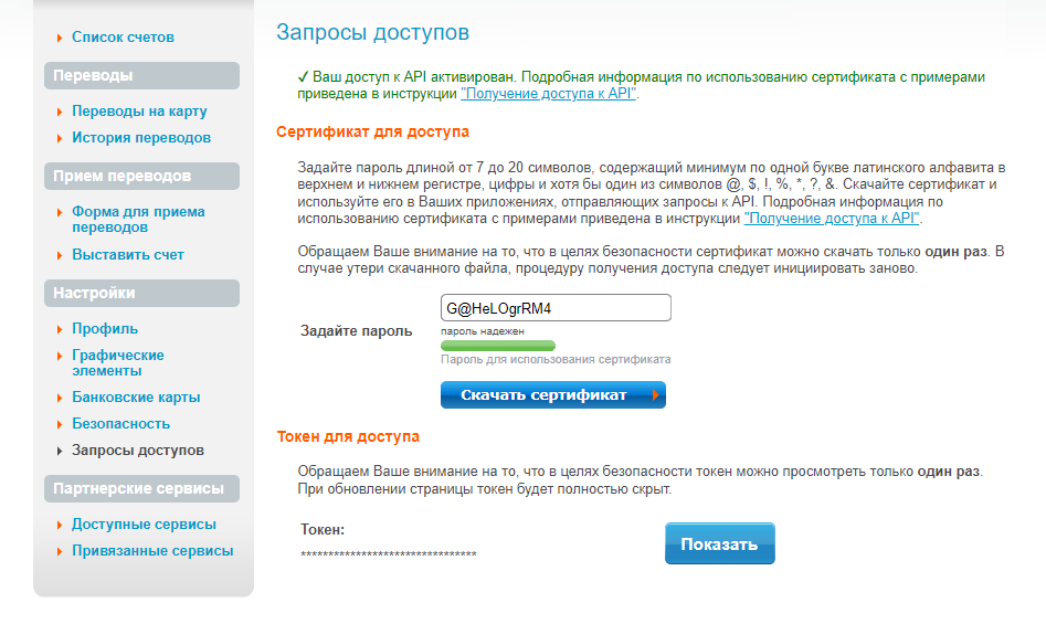В Пользователь, в случае успешной обработки заявки на доступ Вы получите получает письмо с темой "Ваш доступ Выпущен новый сертификат для доступа к API активирован". Задайте пароль и скачайте сертификат из личного кабинета кабинета (пункт меню "Запросы доступовДоступ к API" в разделе "Настройки"). Безопасный пароль должен иметь длину быть длиной от 7 до 20 символов, состоять из букв латинского алфавита (минимум одна буква в верхнем и нижнем регистре), цифр и хотя бы одного символа (@, $, !, %, *, ?, &). Сертификат скачивается в формате PFX. Вы можете проверить Проверьте работоспособность Вашего доступа на тестовом API, см. примеры.