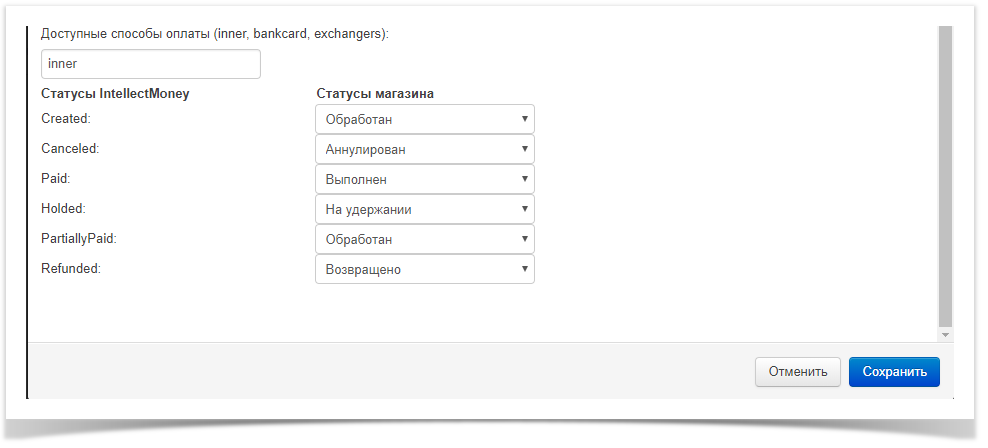 - Статусы заказа. Необходимо выставить соответствие статусов заказа CMS и статусов IntellectMoney.