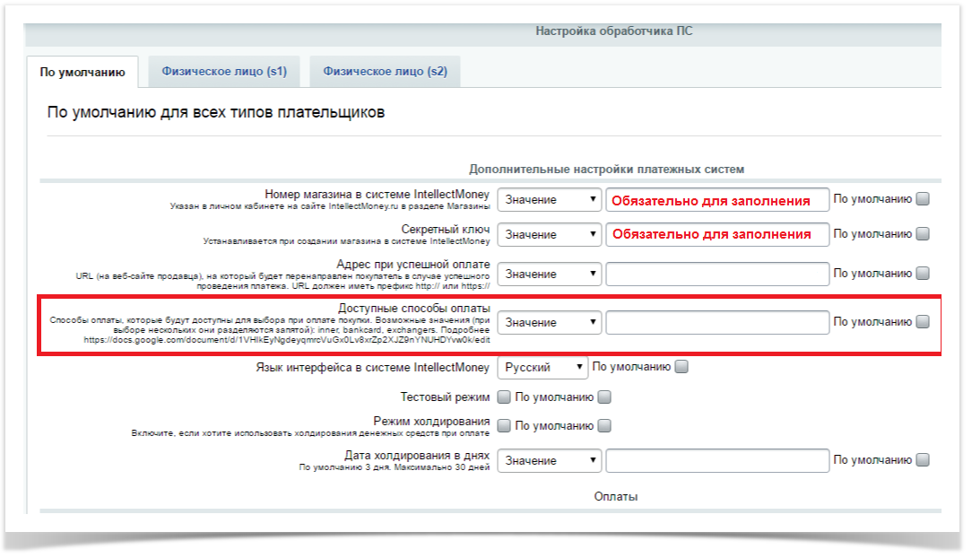 - Доступные способы оплаты - ограничивает количество способов оплаты на платёжной странице - можно не заполнять