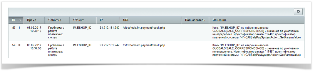 | Описание проблемы: Ключ "IM.ESHOP_ID" не найден в массиве GLOBALS[SALE_CORRESPONDENCE] и значение по умолчанию не определено. Идентификатор заказа: "17XX", идентификатор платежной системы: "4" (CAllSalePaySystemAction::GetParamValue)
