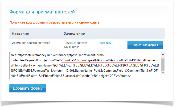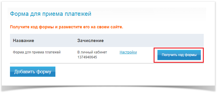 Создаём Первым шагом нужно создать форму приема платежей в личном кабинете Конструктор формы для физических лицкабинете. Эту форму не будет видеть пользователь, она нужна только для взаимодействия с нашей системой. Раскрываем код формы, кликнув по Получить код формы