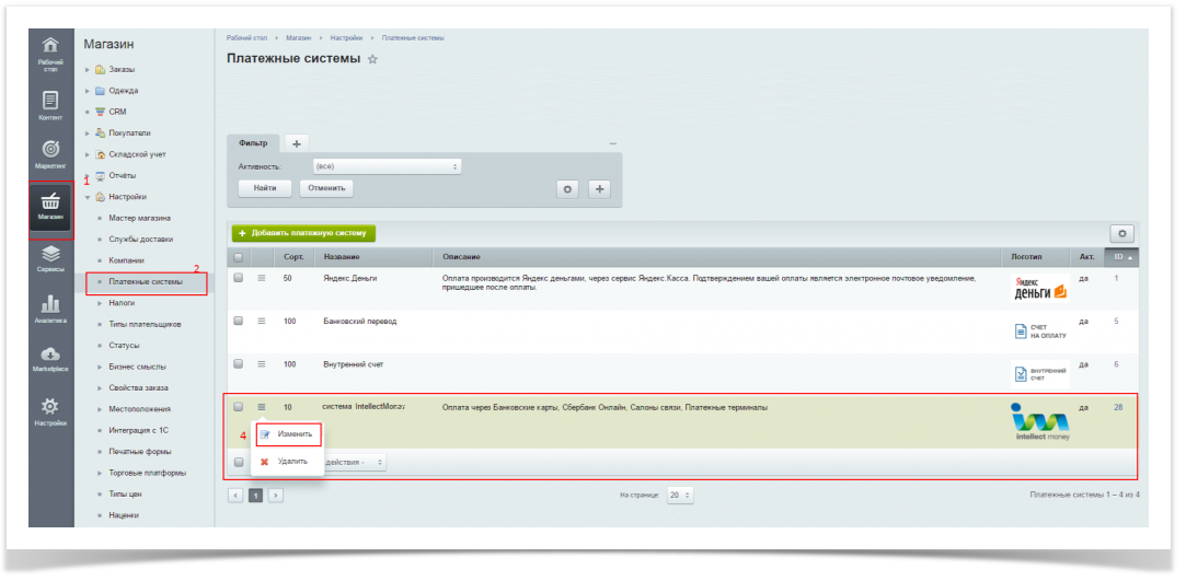 (черновик) Чтобы перейти к настройкам модуля, необходимо в административной части интернет-магазина перейти в раздел Настройки->Магазин->Платёжные системы, где Вы увидите наш модуль. Кликнув "Изменить", Вы сможете настроить модуль.