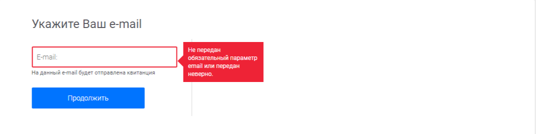 Такое сообщение отображается в том случае, если email передан не корректно (например: mail , вместо mail@mail.ru), или передали не верно (указали e-mail, на который не зарегистрирована Ваша организация (Логин для входа в личный кабинет IntellectMoney)), переданный параметр user_email будет игнорироваться, а пользователю будет показано окно для ввода e-mail, после корректного заполнения которого, процесс оплаты будет продолжен.
