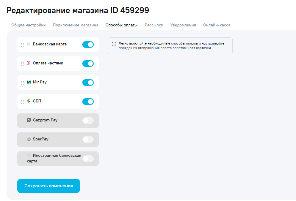 Наша система предоставляет возможность гибкой настройки доступных способов оплаты. Вы можете самостоятельно включать и выключать любой из способов оплаты.