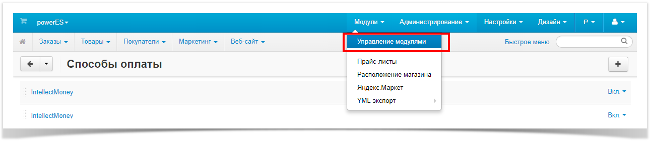 Процесс настройки и установки1. В личном кабинете IntellectMoney в разделе "магазины" создаем новый магазин. 2. Заходим в настройки магазина и настраиваем вкладки "общие" и "прием платежей". Протокол надо указать "IntellectMoney", Result URL - http://ваш_сайт/index.php?dispatch=payment_notification.result&payment=intellectmoney. Если планируете использовать холдирование денежных средств, во вкладке "прием платежей"→"расширенные настройки" следует поставить галочку "Принимать только уникальные ID покупки". Подробнее о настройке личного кабинета IntellectMoney можно прочитать здесь. 3. Скачиваем архив с модулем по ссылке и распаковываем в корневую директорию с вашим сайтом, подтверждая слияние папок. 4. Заходим в панель администратора сайта (http://ваш_сайт/admin.php) в раздел "модули"→ "управление модулями".