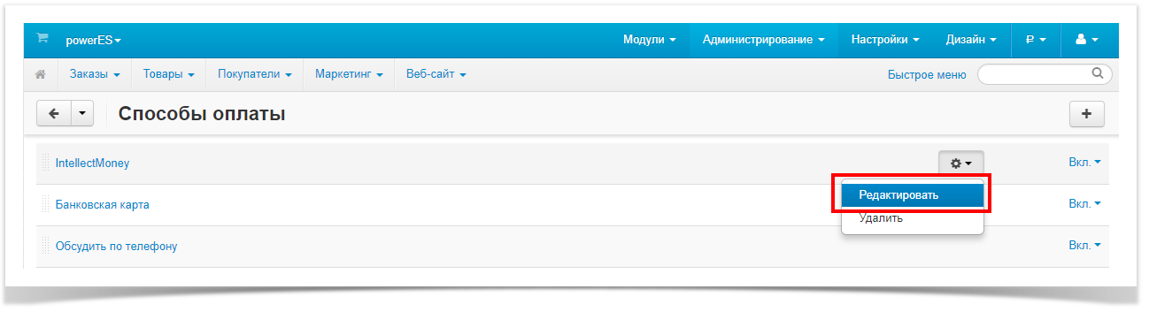 10. Далее на строке выбора способа оплаты "IntellectMoney" нажимаем "колесико"→"Редактировать".