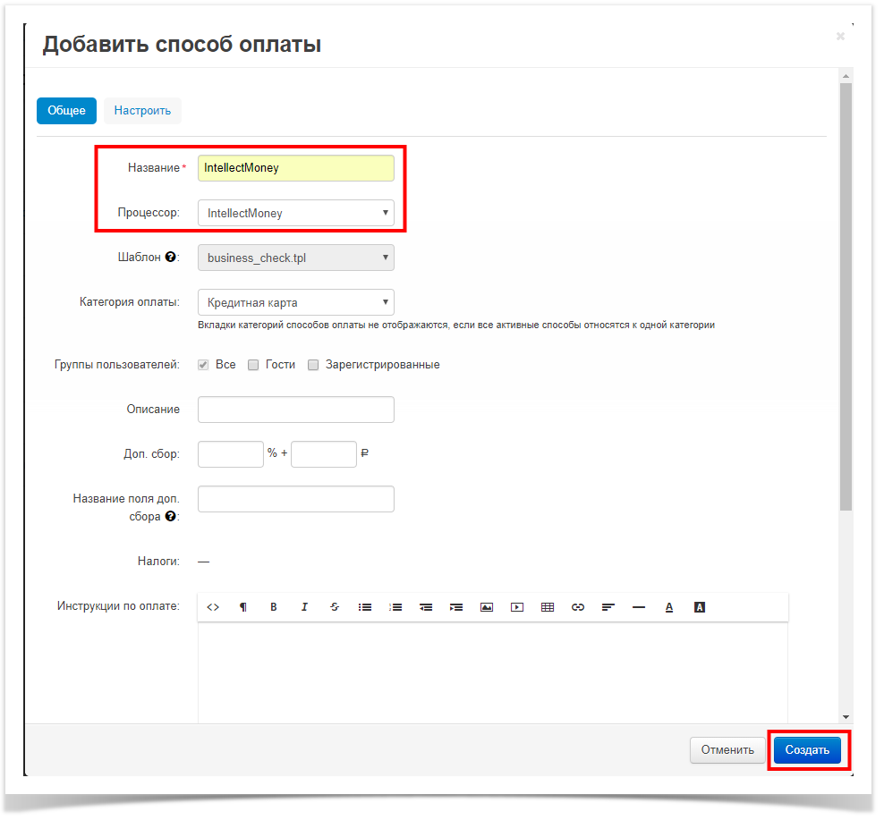 9. Заполните поле "Название" -"IntellectMoney", поле "Процессор" выберите "IntellectMoney" и нажмите "Создать".