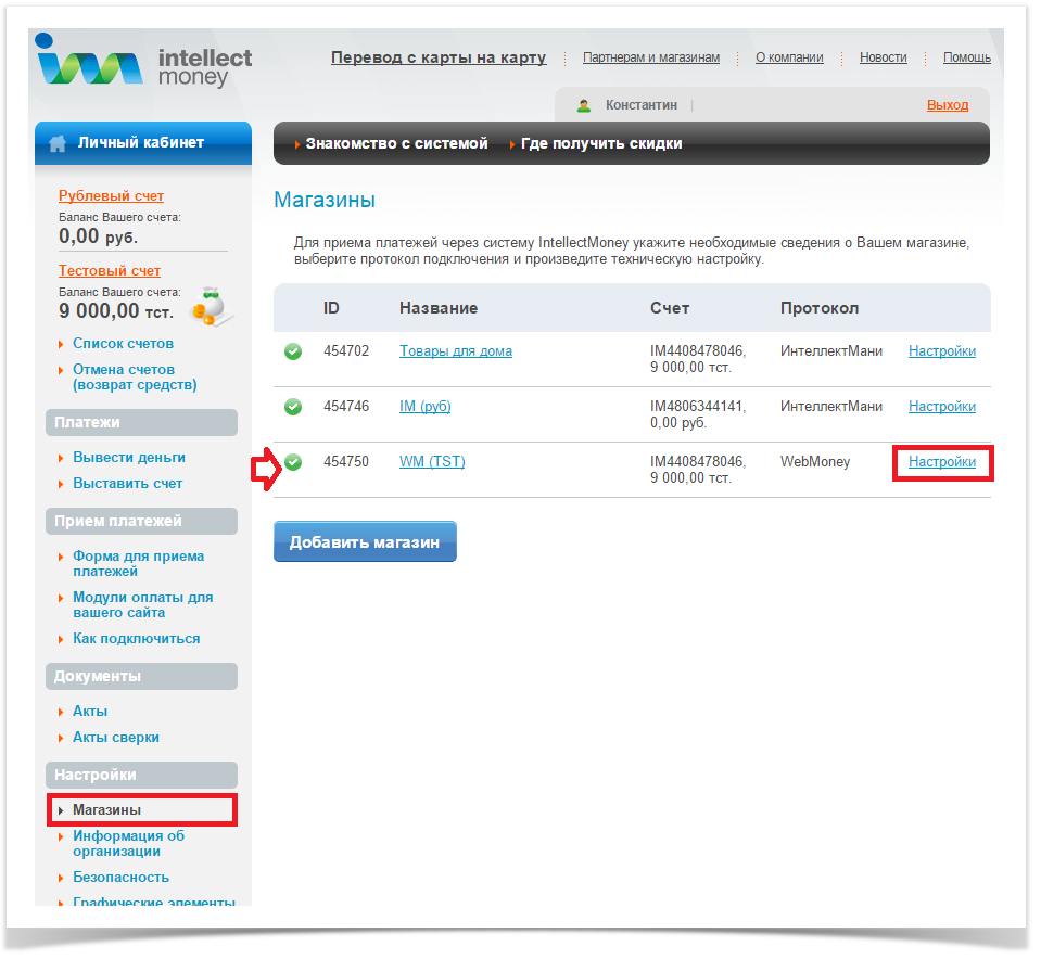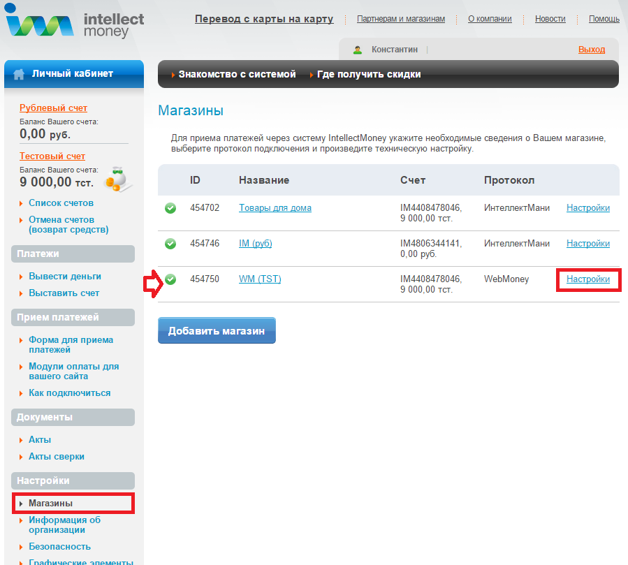 В личном кабинете IntellectMoney выбеите пункт меню "Магазины", в открывшемся списке магазинов выберите интересующий Вас в данный момент и нажмите на ссылку "настроить: