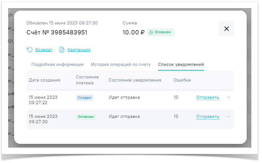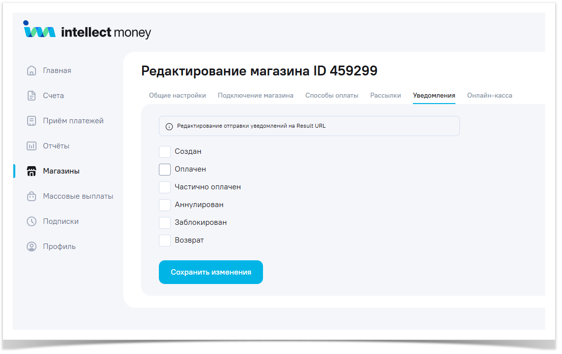 Личный кабинет предоставляет возможность просмотра, повторной отправки и просмотра ответов на уведомления от системы Intellectmoney.