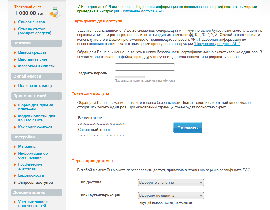 Задайте пароль и скачайте сертификат из личного кабинета (пункт меню "Запросы доступов" в разделе "Настройки"). Безопасный пароль должен иметь длину от 7 до 20 символов, состоять из букв латинского алфавита (минимум одна буква в верхнем и нижнем регистре), цифр и хотя бы одного символа (@, $, !, %, *, ?, &). Сертификат скачивается в формате PFX. Вы можете проверить работоспособность Вашего доступа на тестовом API, см. примеры.