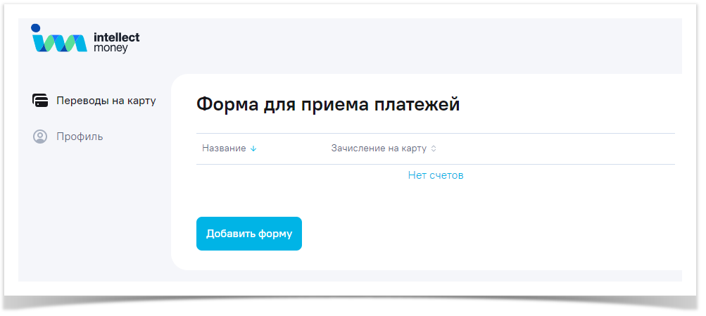 Вкладка «Форма для приёма переводов» ведет к списку сохраненных форм. Здесь можно нажать «Добавить форму» и разместить полученный код на своём сайте или в социальной сети.