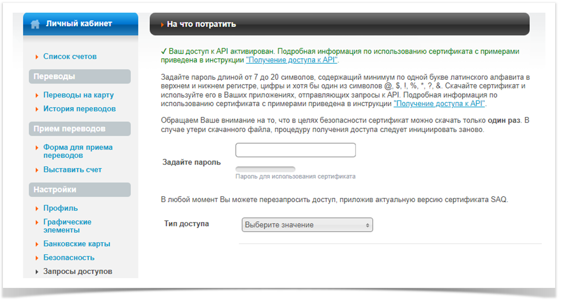 5. После того, как служба безопасности IntellectMoney предоставит доступ к API, нужно задать пароль и скачать сертификат.