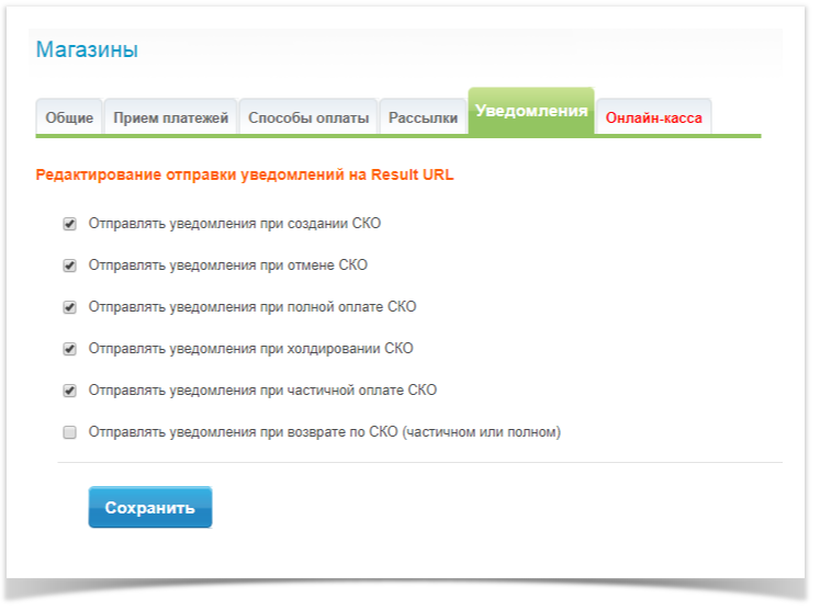 Управлять уведомлениями можно в личном кабинете в настройках магазина. По-умолчанию отправка запроса о возврате по СКО отключена