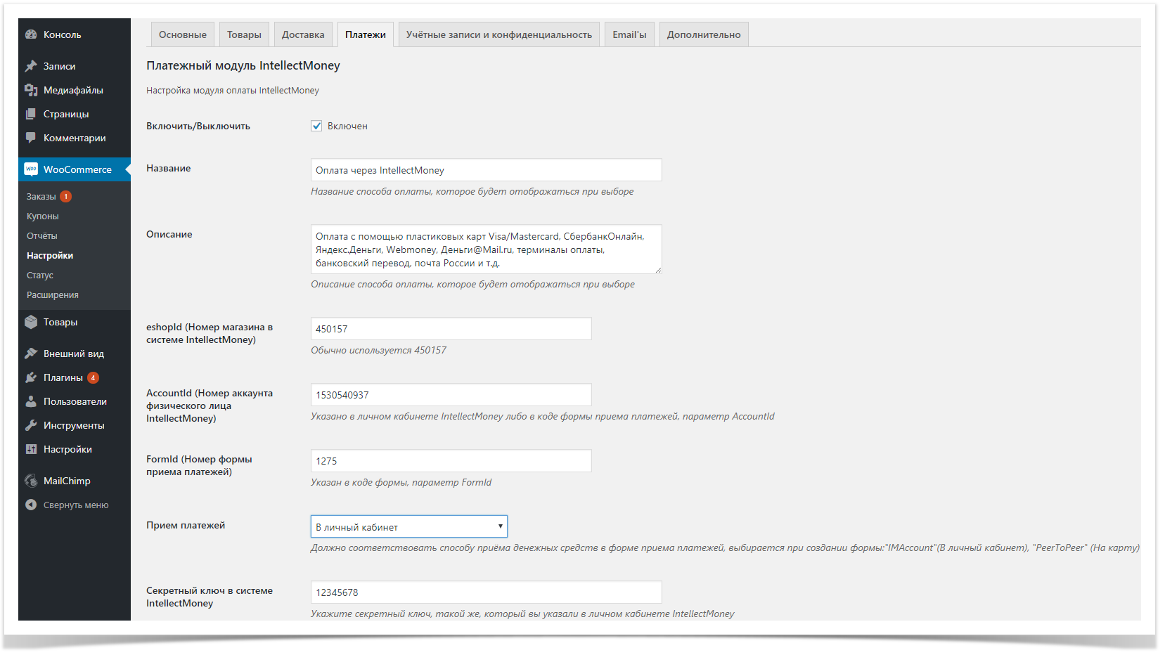 - Для работы с системой IntellectMoney в вашем интернет-магазине должен быть установлен модуль WooCommerce.