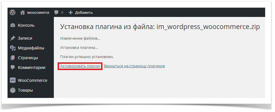 - Скопировать папку файлы модуля в папку \wp-content\plugins\im_wordpress_woocommerce или установите через менеджер плагинов в админ панели вашего сайта: