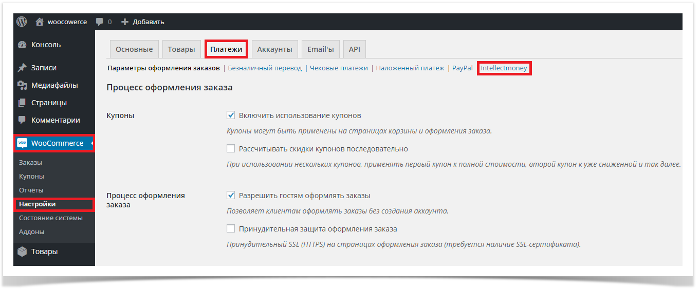 d) После установки активируем плагин - В админ. панели wordpess зайдите в раздел WooCommerce -> настройки -> вкладка “Платежи“ -> IntellectMoney.