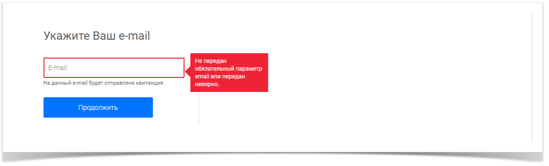 Такое сообщение отображается в том случае, если email передан не корректно (например: mail , вместо mail@mail.ru), или передали не верно (указали e-mail, на который не зарегистрирована Ваша организация (Логин для входа в личный кабинет IntellectMoney)), переданный параметр user_email будет игнорироваться, а пользователю будет показано окно для ввода e-mail, после корректного заполнения которого, процесс оплаты будет продолжен.