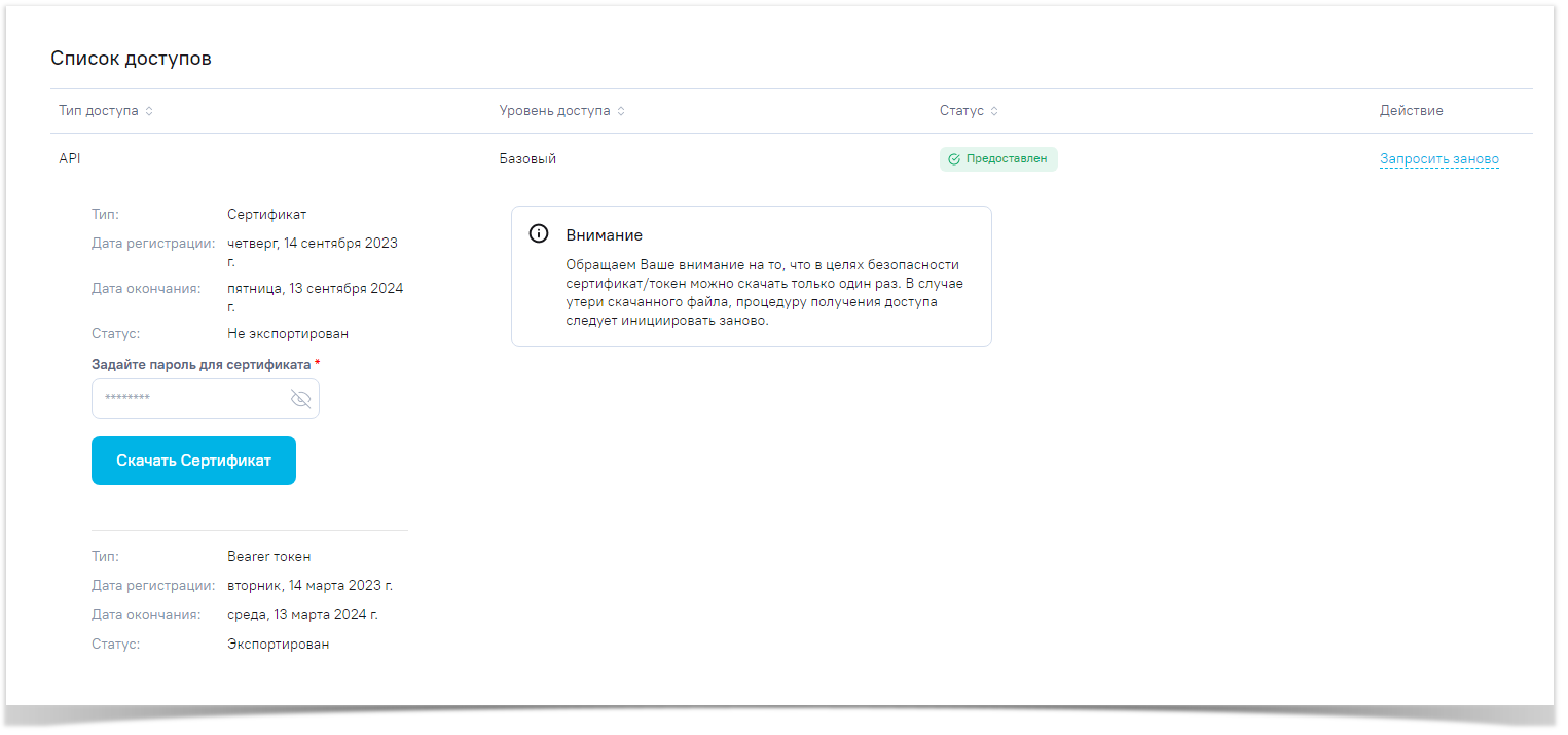 Обращаем Ваше внимание на то, что в целях безопасности сертификат можно скачать только один раз. Токен и его секретный ключ также отображаются только один раз. В случае утери скачанного файла или токена, необходимо запросить новые с помощью формы перезапроса доступа.