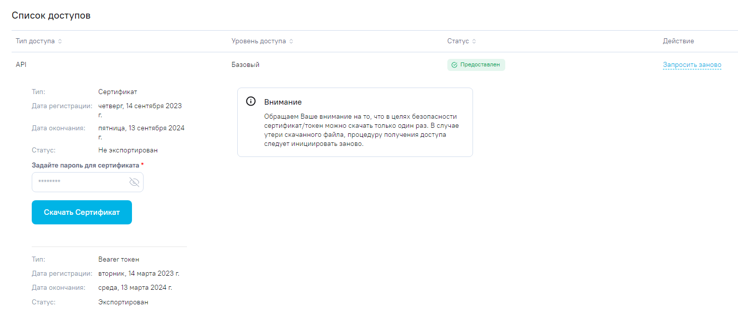 Обращаем Ваше внимание на то, что в целях безопасности сертификат можно скачать только один раз. Токен и его секретный ключ также отображаются только один раз. В случае утери скачанного файла или токена, необходимо запросить новые с помощью формы перезапроса доступа.