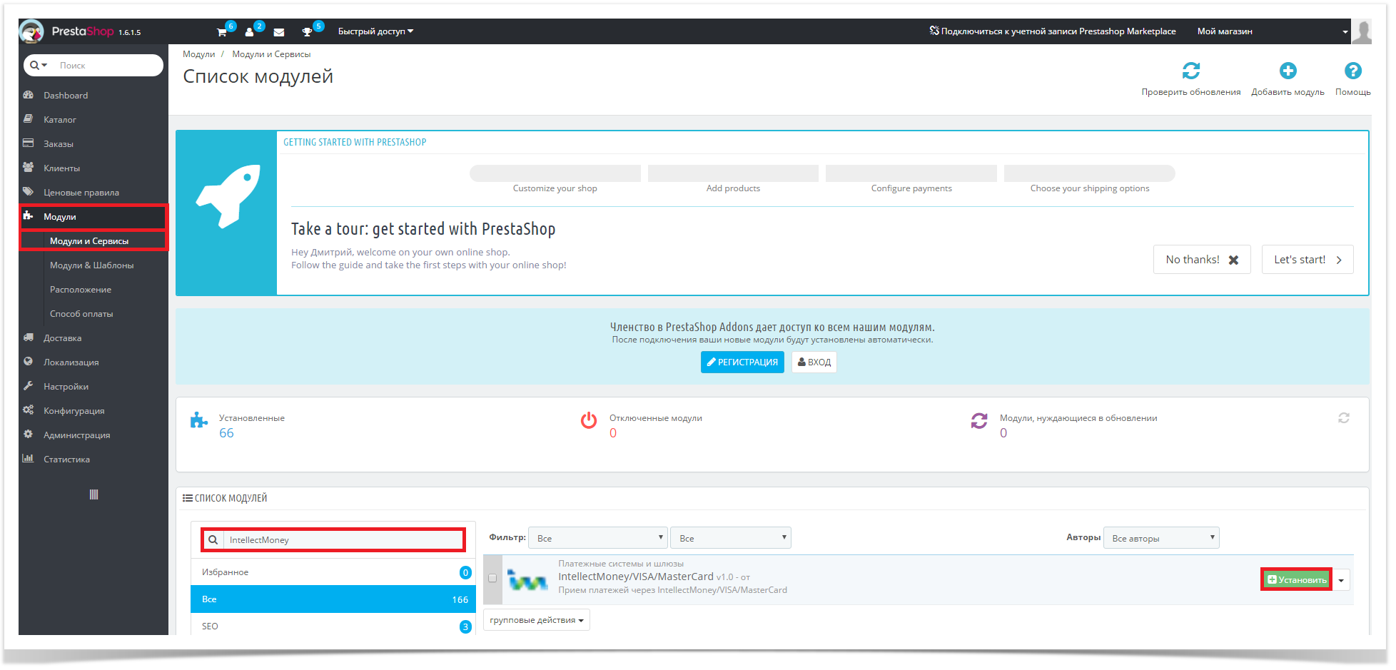 3. В “Административной панели“->Модули->Модули и сервисы-> через поиск найдите модуль Intellectmoney и установите его.