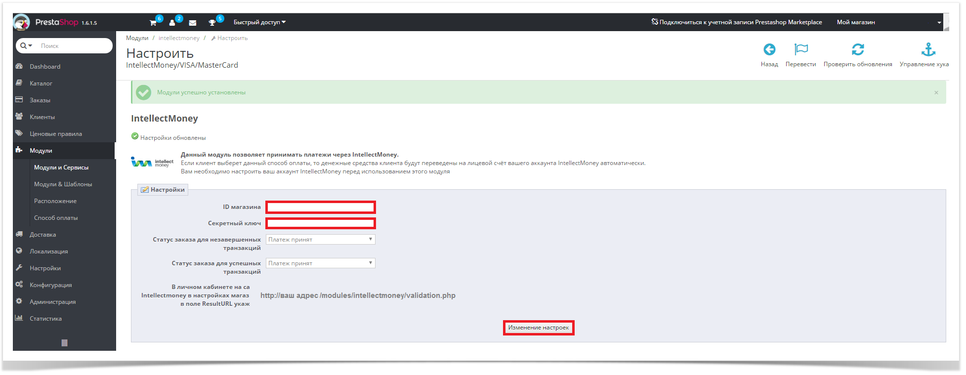 6. В личном кабинете на сайте Intellectmoney->магазины->Настройки магазина->вкладка “Прием платежей“->(параметр ResultURL) указать - http://х.х.х/modules/intellectmoney/validation.php где х.х.х -адрес вашего сайта