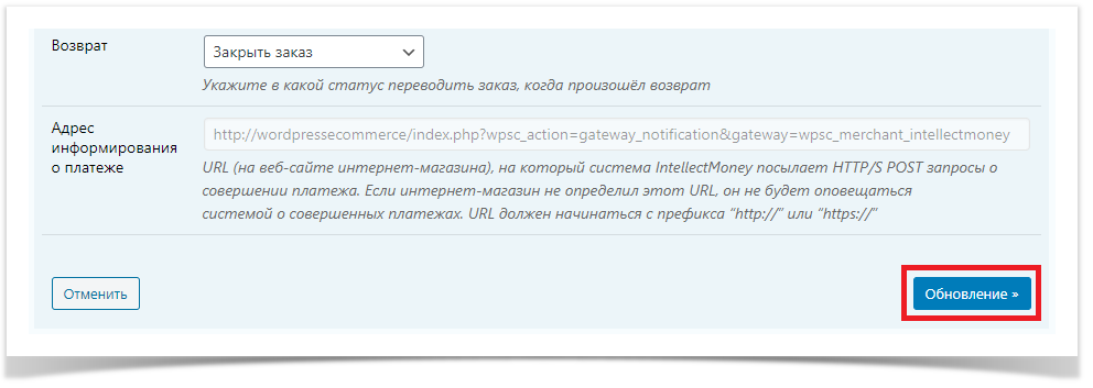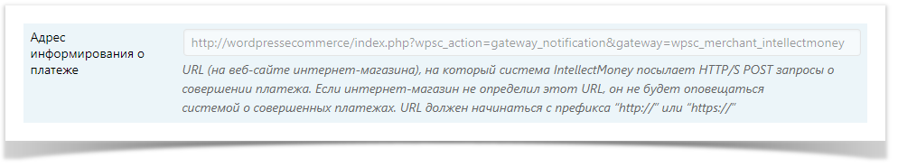 s. Адрес информирования о платеже - укажите данный адрес в настройках магазина, в личном кабинете IntellectMoney, в поле ResultUrl. - Сохраните введенные настройки