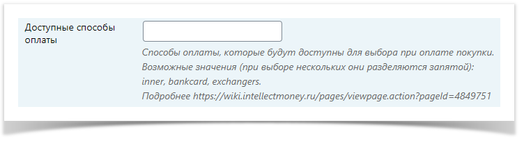 g. Доступные способы оплаты - способы оплаты, которые будут доступны для выбора при оплате покупки. Возможные значения (при выборе нескольких они разделяются запятой): inner, bankcard, exchangers. Подробнее - Соответствия preference & inputType