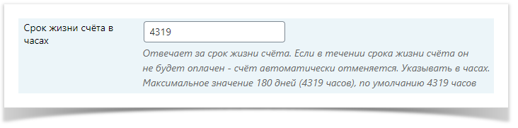 d. Срок жизни счёта в часах - отвечает за срок жизни счёта. Если в течении срока жизни счёта он не будет оплачен - счёт автоматически отменяется. Указывать в часах. Максимальное значение 180 дней (4319 часов), по умолчанию 4319 часов. При включенном параметре 'Режим холдирования' максимальное значение 119 часов по умолчанию 72 часа