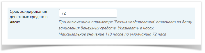 e. Срок холдирования денежных средств в часах - при включенном параметре 'Режим холдирования' отвечает за дату зачисления денежных средств. Указывать в часах. Максимальное значение 119 часов по умолчанию 72 часа