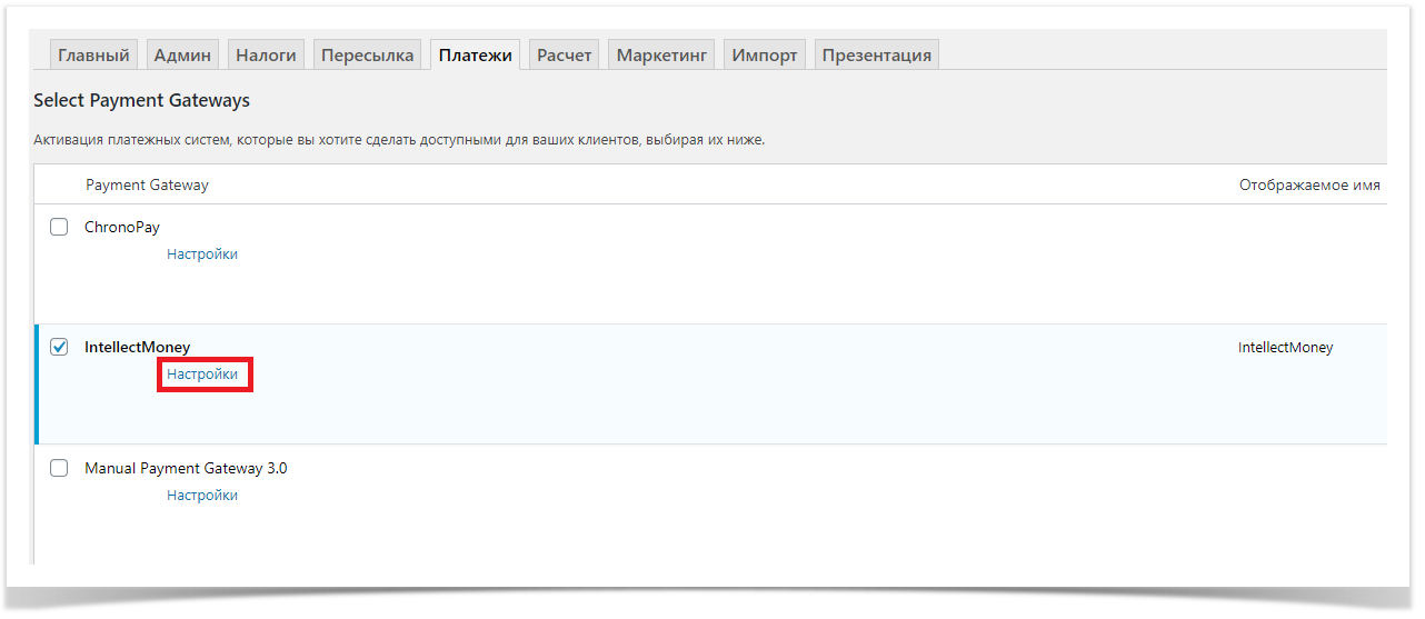 - В строке IntellectMoney нажмите на ссылку "Настройки".