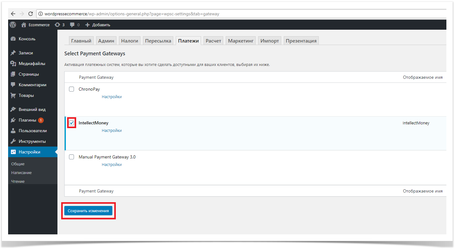 - Напротив IntellectMoney установите галочку и внизу нажмите кнопку "Сохранить изменения"