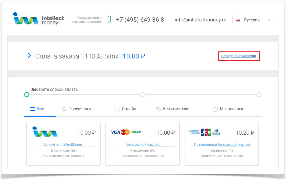 Также ссылку можно изменять динамически, передавая в форме выставления платежа параметр backUrl. Подробнее - Протокол приема платежей Intellectmoney