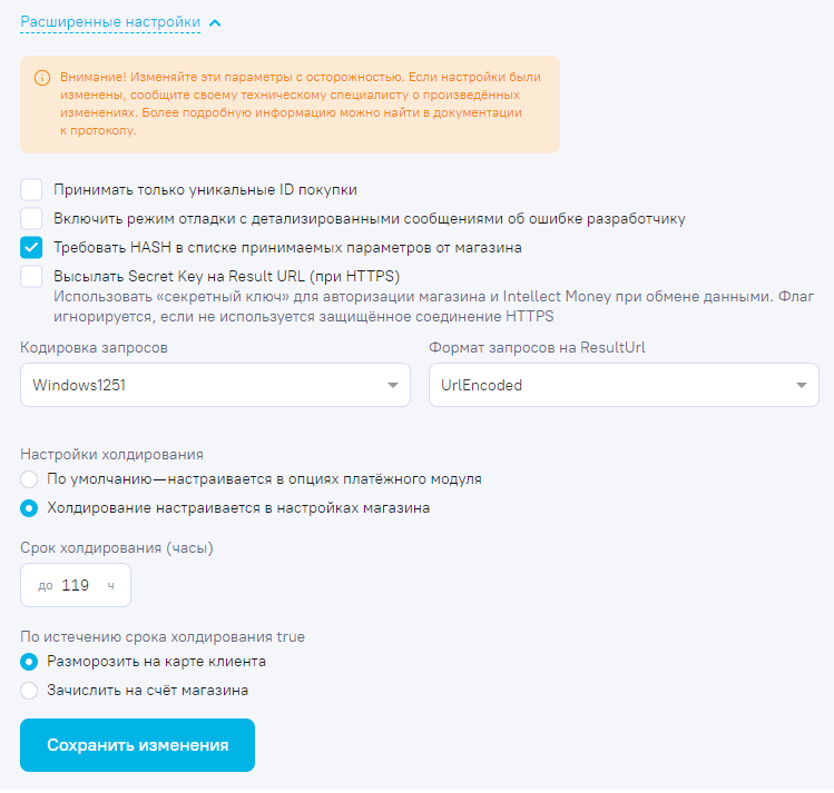 | Максимальный срок холдирования | Определяет время, в течении которого денежные средства на карте покупателя будут захолдированы (заморожены), в часах. Целочисленное значение от 0 до 119 |