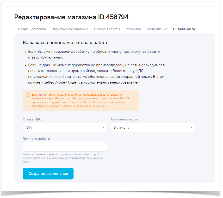 Когда персональный менеджер IntellectMoney сообщит Вам о включении доступа к управлению кассой, зайдите в настройки магазина в раздел "Онлайн-касса", установите ставку НДС, измените состояние кассы на "Включена", группу устройств необходимо уточнить у поддержки кассы.