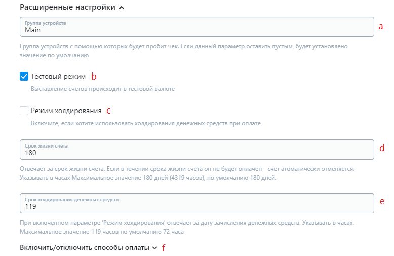 4. Срок жизни счёта - отвечает за срок жизни счёта. Если в течении срока жизни счёта он не будет оплачен - счёт автоматически отменяется. Указывать в часах. Максимальное значение 180 дней (4319 часов), по умолчанию 4319 часов. При включенном параметре 'Режим холдирования' максимальное значение 119 часов по умолчанию 72 часа