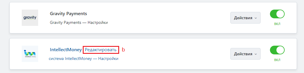 2. Наведите курсор на способ оплаты IntellectMoney и нажмите "Редактировать"
