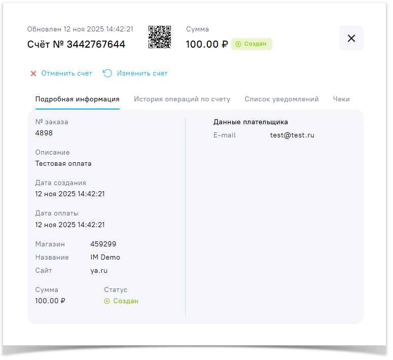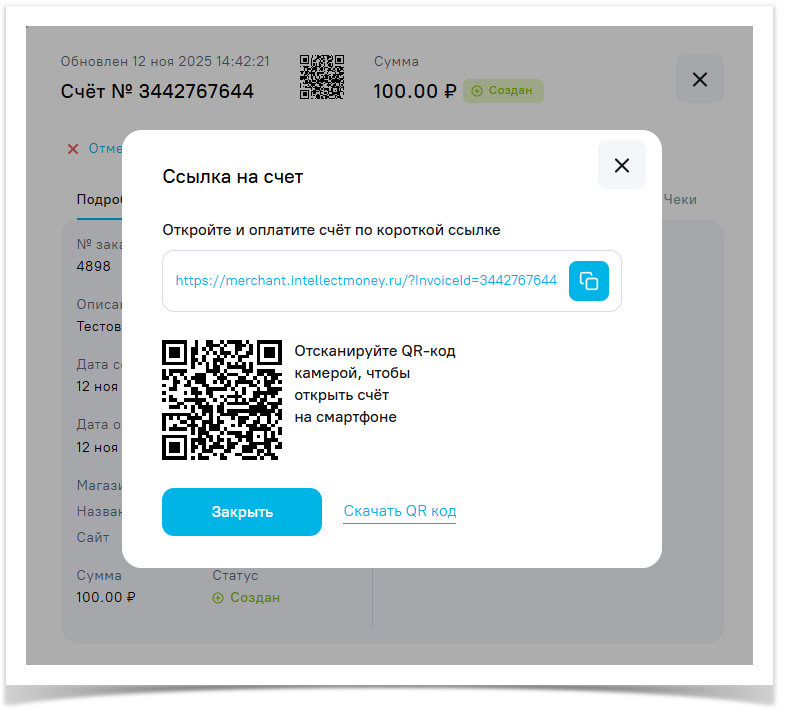 По всем выставленным счетам можно повторно отправить ссылку или QR-код, если вдруг клиент потерял его в первый раз.