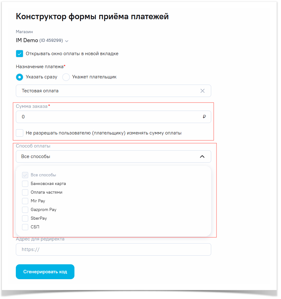Также можно выбрать способы оплаты, если оставить только СБП, то при написании суммы клиент сразу попадет на оплату через СБП. Если оставить все способы или несколько, то при сканировании кода у клиента будет возможность выбора, как он хочет оплатить.