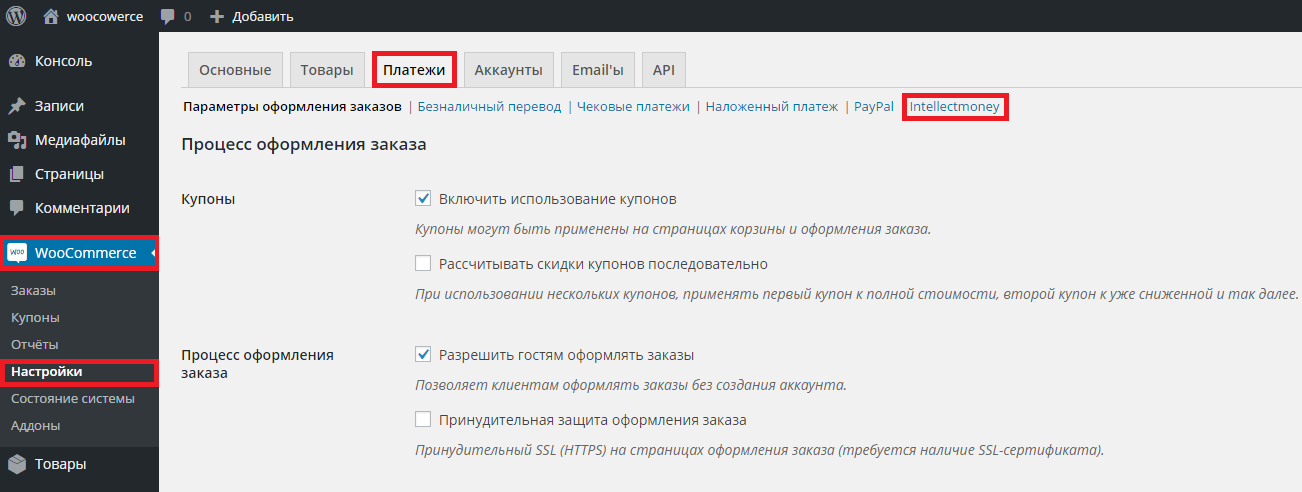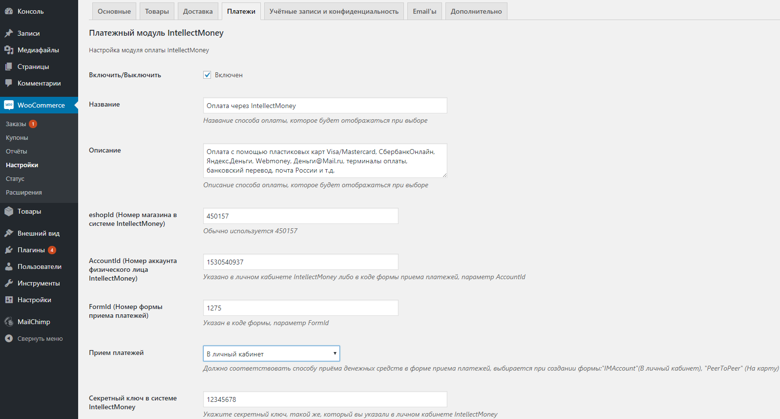 d) После установки активируем плагин - В админ. панели wordpess зайдите в раздел WooCommerce -> настройки -> вкладка “Платежи“ -> IntellectMoney.