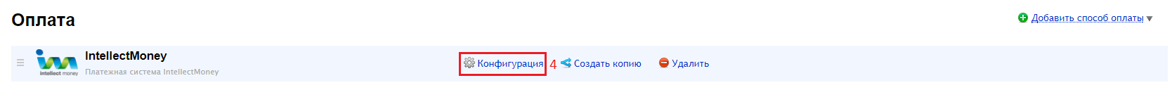 - На строке "IntellectMoney" нажмите ссылку "Конфигурация"