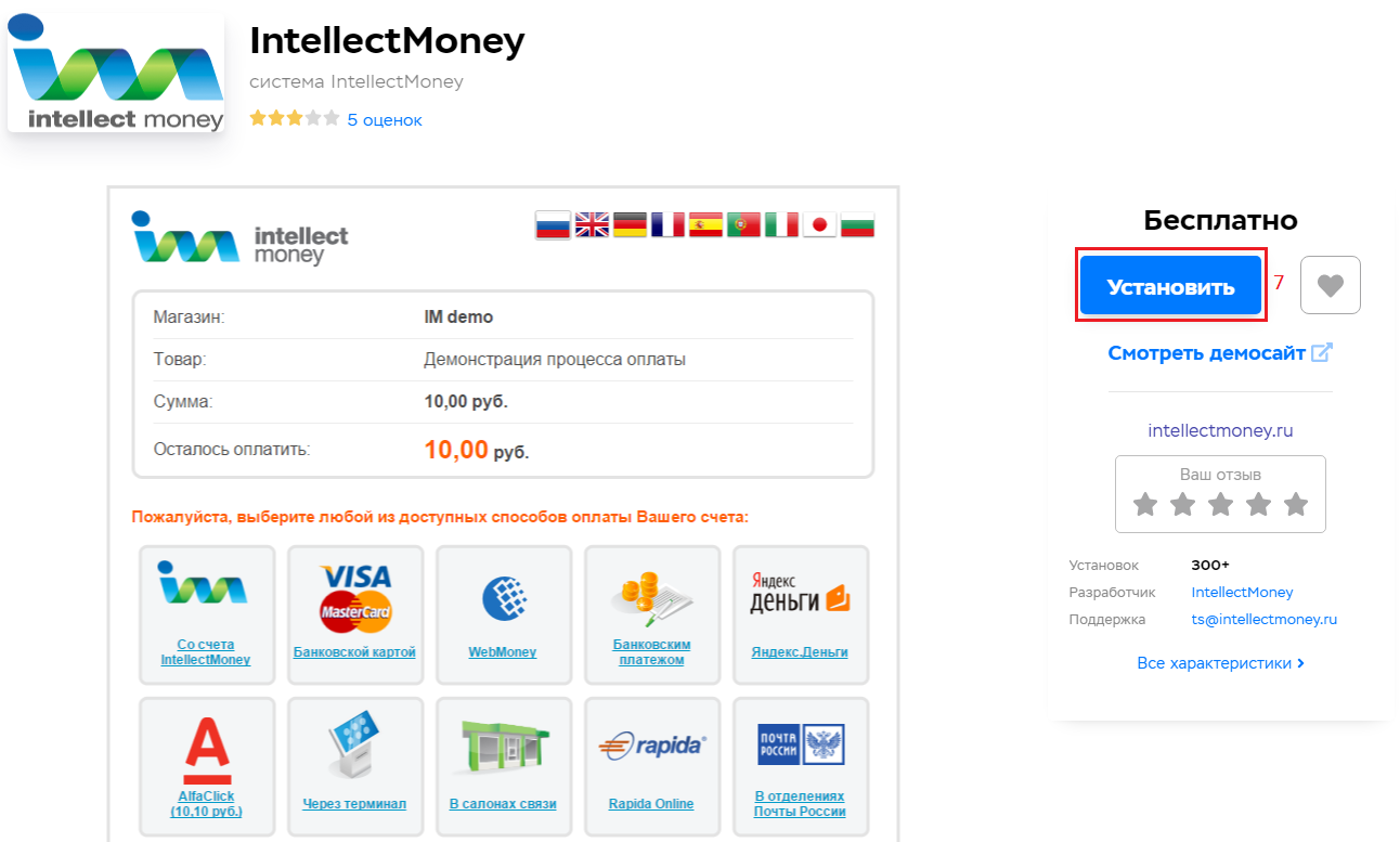 - Описание - пример: Оплата платежным агрегатором IntellectMoney. Более 20-ти способов, включая банковскую карту