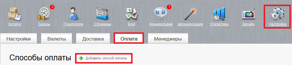 - В админ. панели зайдите в Настройки->Оплата->Добавить способ оплаты.