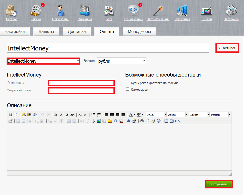 - В выпадающем списке выберите Intellectmoney, введите ID магазина и секретный ключ из личного кабинета Intellectmoney, поставьте галочку "Активен" и нажмите "Сохранить"