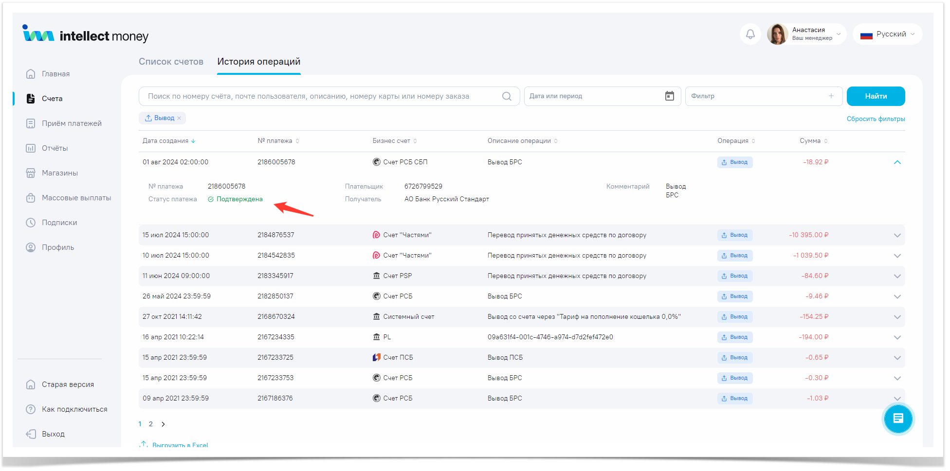 Если раскрыть информацию по выводу, то можно увидеть статус платежа: