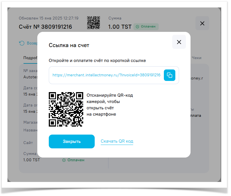 По каждому из выставленных счетов есть возможность скопировать ссылку на счет для повторной отправки или скачать QR-код. Для этого необходимо открыть нужный счет и нажать на QR-код сверху.