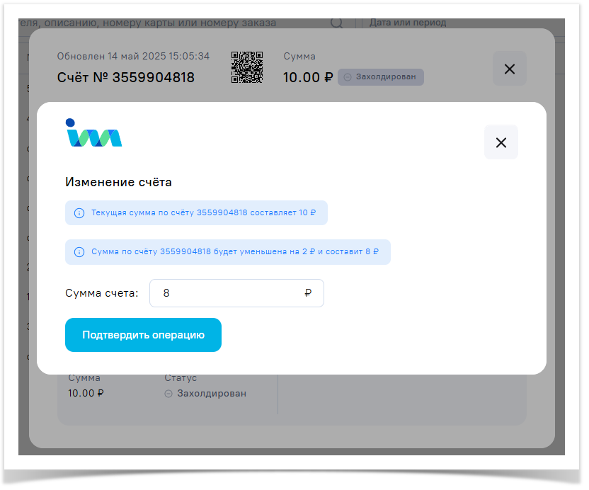 Откроется окно изменения суммы. В данном окне необходимо ввести сумму, которая должна быть зачислена на счет магазина, и нажать на кнопку Подтвердить операцию